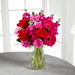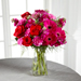 The power of pink is packed into one beautifully blushing bouquet to make your recipient's day one they will never forget! Red roses make the hot pink petals of carnations, gilly flower, and gerbera daisies pop in this fun and fanciful flower arrangement accented with lush greens and presented in a gathered square clear glass vase. Berried happiness in every way, this bouquet is set to create a standout birthday, congratulations, or thank you gift. GOOD bouquet includes 11 stems. Approx. 15"H x 9"W. BETTER bouquet includes 15 stems. Approx. 15"H x 10"W. BEST bouquet includes 19 stems. Approx. 16"H x 14"W.